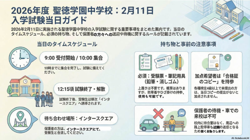 2026年2月11日(水・祝)に実施される聖徳学園中学校の入試についてのご案内です。