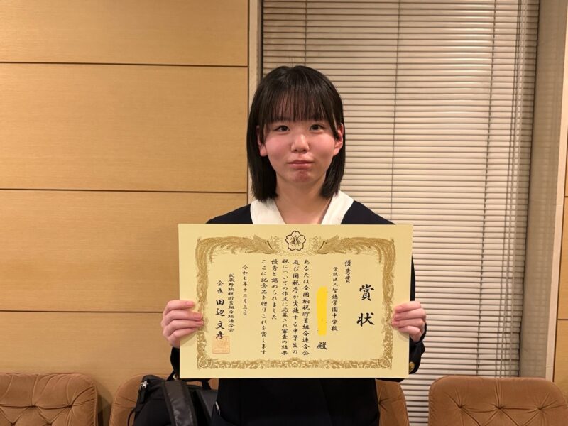 中学3年生公民の夏季休暇課題「中学生の税に関する作文」において、中学3年Yさんが「武蔵野納税貯蓄組合総連合会優秀賞」を受賞し、12月3日(水)武蔵野スイングホールにて表彰式が行われました。