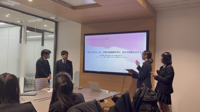 都会のオフィスの重厚な会議室でのプレゼンテーションだったので、生徒たちはかなり緊張していました。校内ではできないとてもよい体験だと感じました。