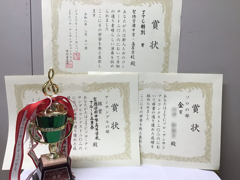 ソロの部で高校2年生Yさんが金賞を受賞。アンサンブルの部ではフルート五重奏が銀賞を受賞。合奏の部ではJTC特別賞を受賞しました。一歩ずつですが着実な成長の見られる本番となりました。