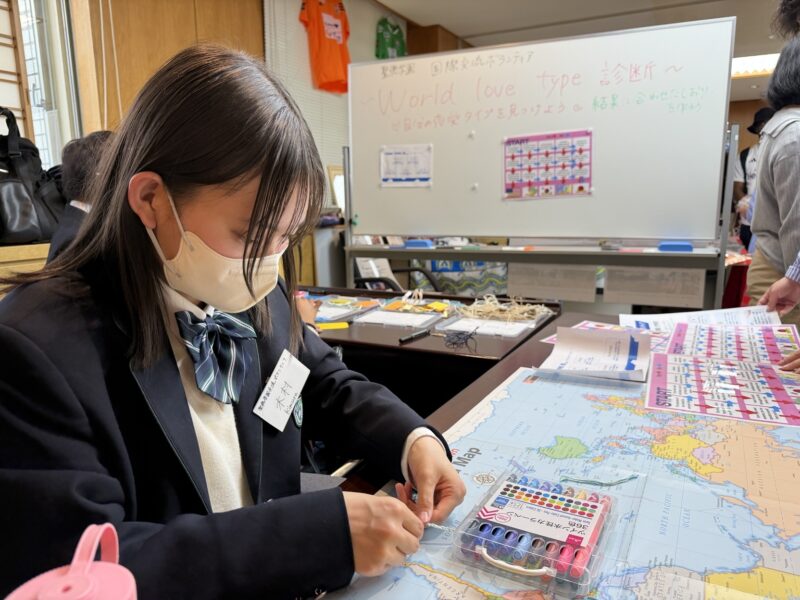 ブースではICUの留学生と一緒に考えた企画である「World love type診断」というワークショップを行いました。チャートを進んでいき自分のlove typeを見つけ、結果に合わせたしおりを作るというものです。