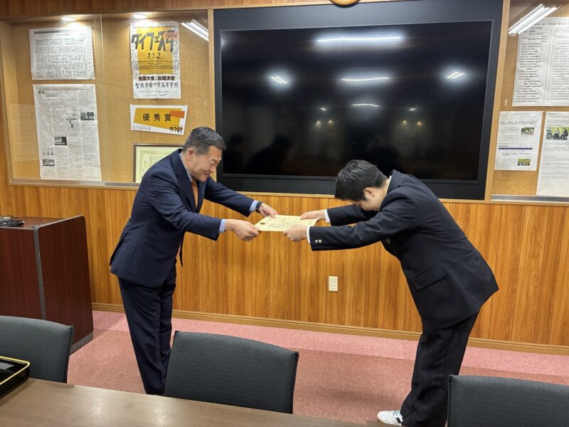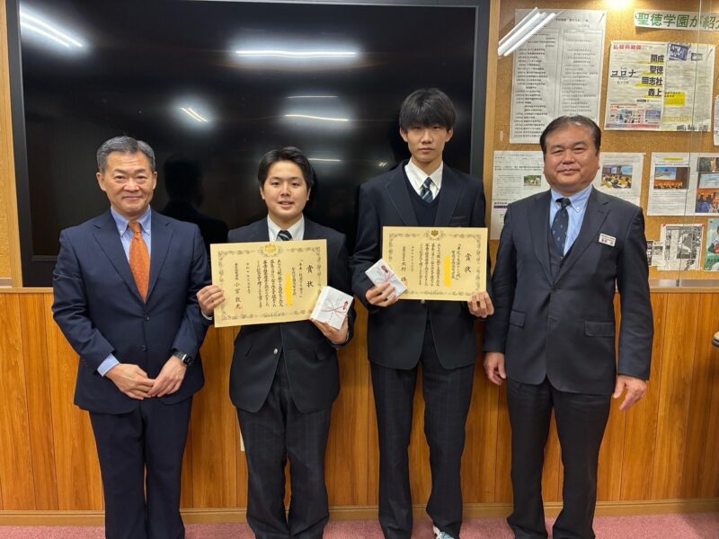 高校1年生公共の夏季休暇課題「高校生の税に関する作文」において、高校1年生が東京都国税局長賞と武蔵野税務署長賞を受賞し本日会議室にて表彰式を行いました。
